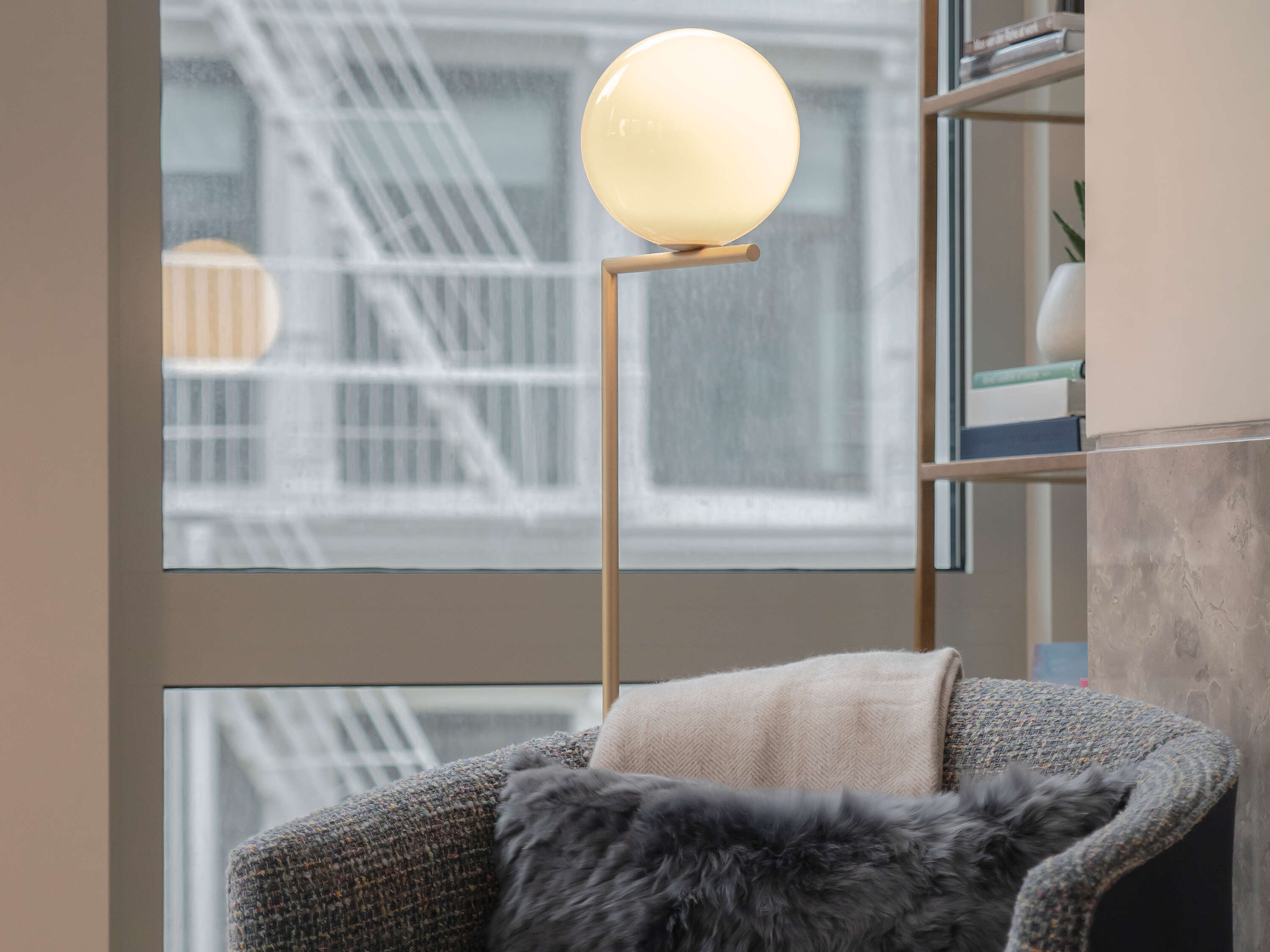 Apparecchio di illuminazione da terra a luce diffusa. Telaio in ottone, spazzolato e verniciato trasparente o acciaio cromato. Diffusore opalino di vetro soffiato. Dimmer presente sul cavo di alimentazione.