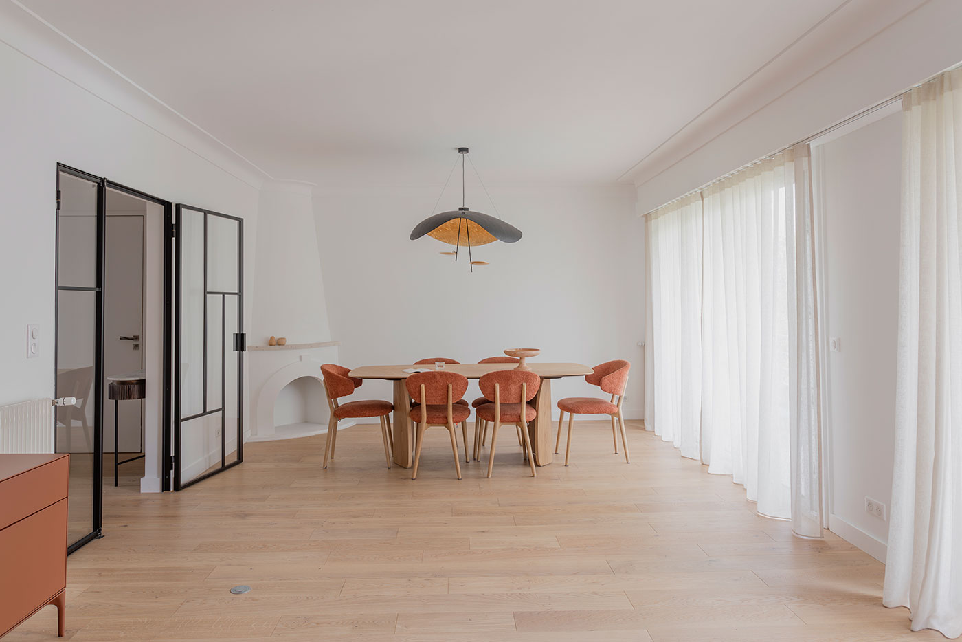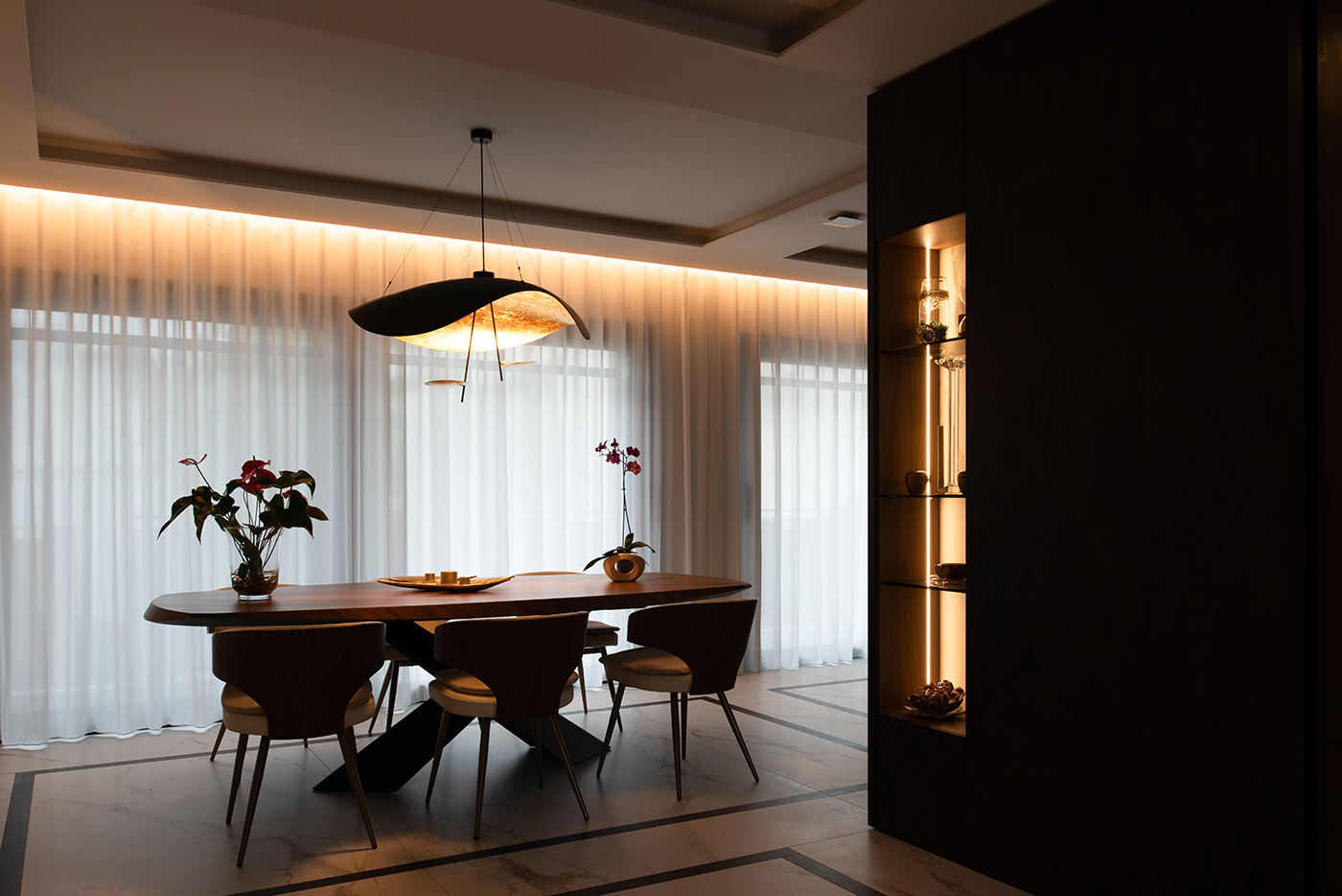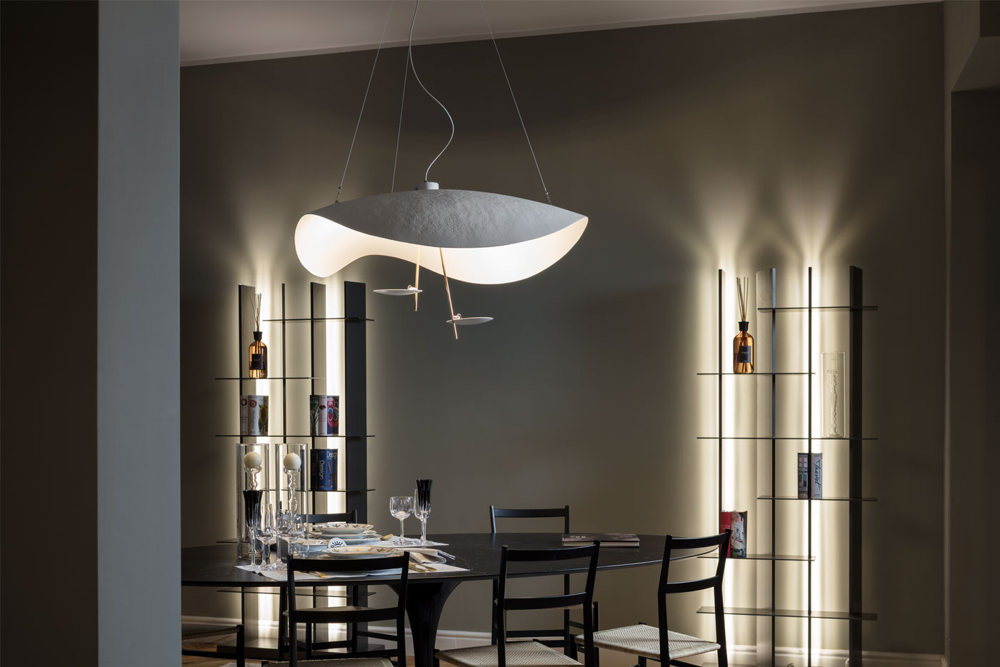 Lederam rappresenta il rigore del gesto fatto per tracciare una linea: i piccoli dischi dal colore caldo e morbido racchiudono un modulo LED dalla forma piattissima che permette di pensare in maniera leggera e di creare quindi lampade sottili dalle forme sospese con le linee curve e sinuose.