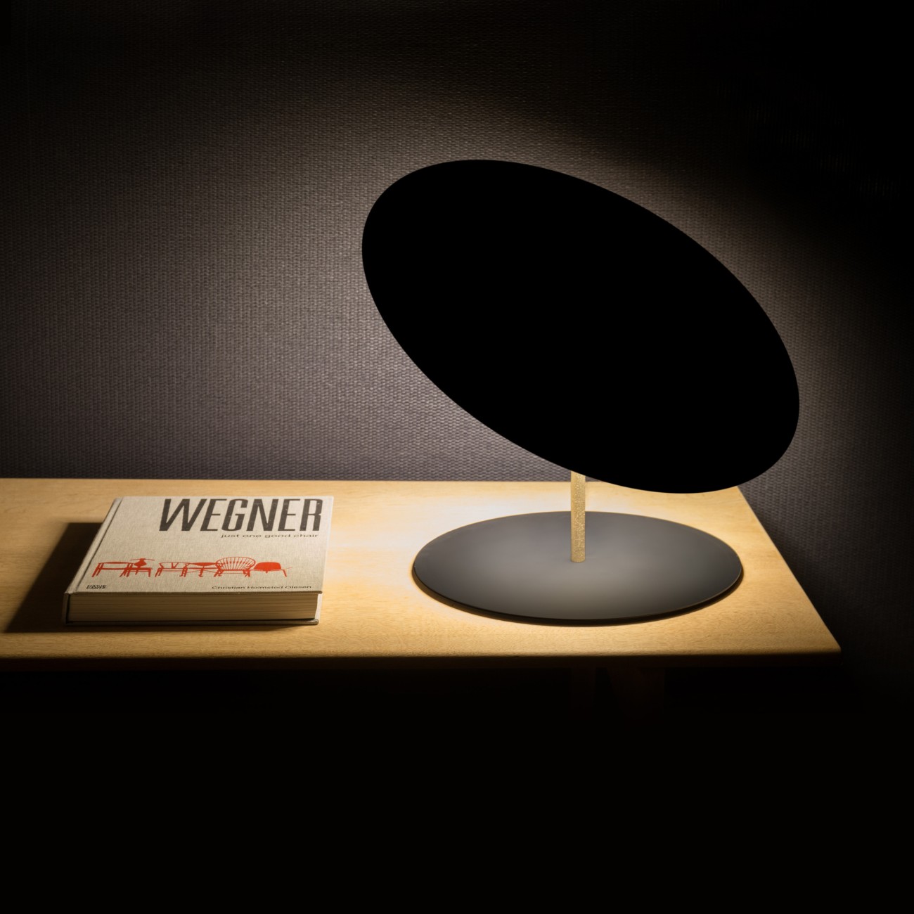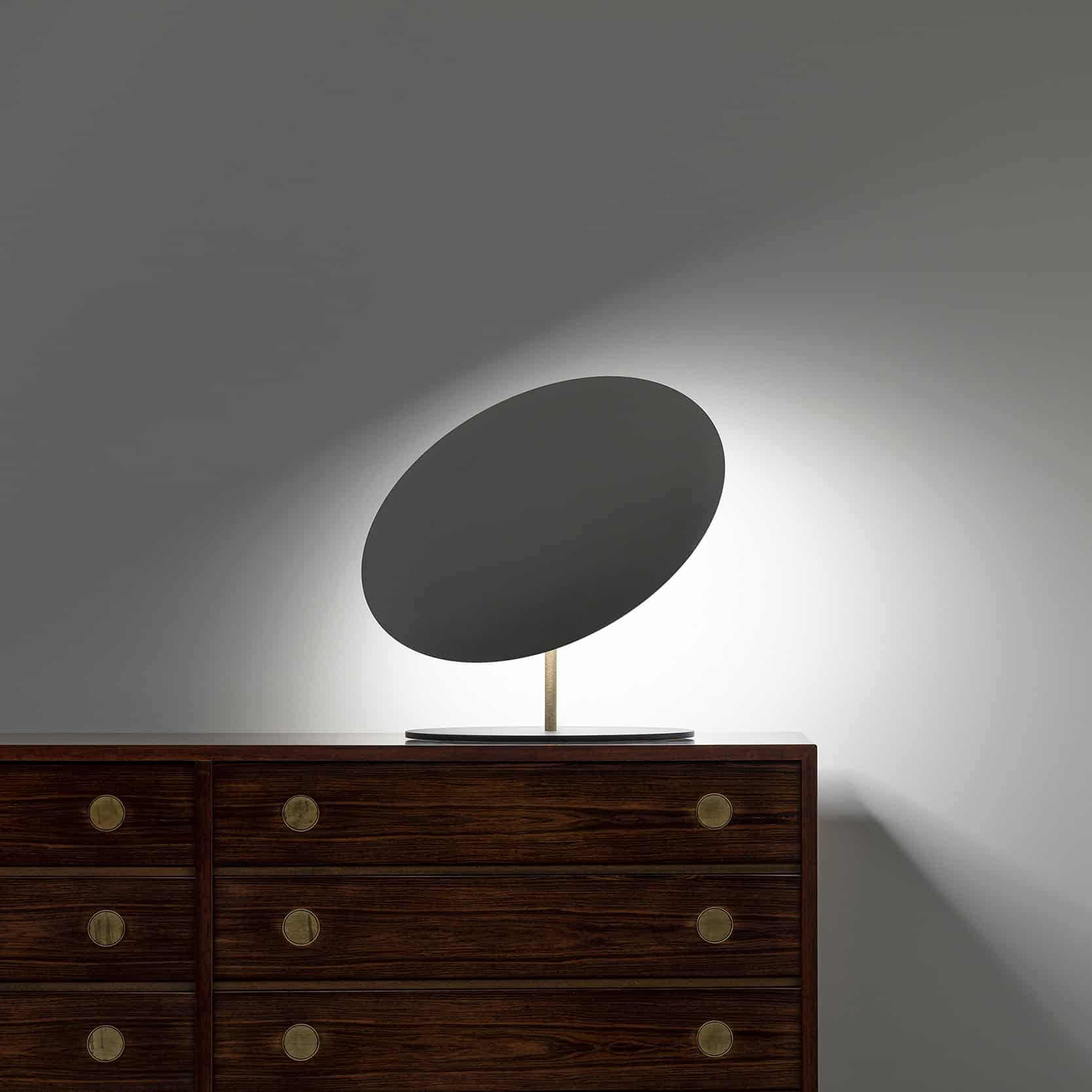 Apparecchio illuminante da tavolo. Disco con finitura a specchio orientabile in tutte le direzioni. Retro del disco blu opaco. Stelo in ottone. Dimmer lungo il cavo. Cavo nero.